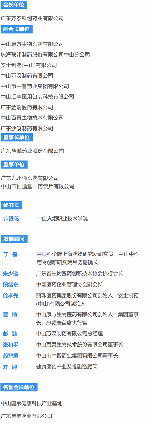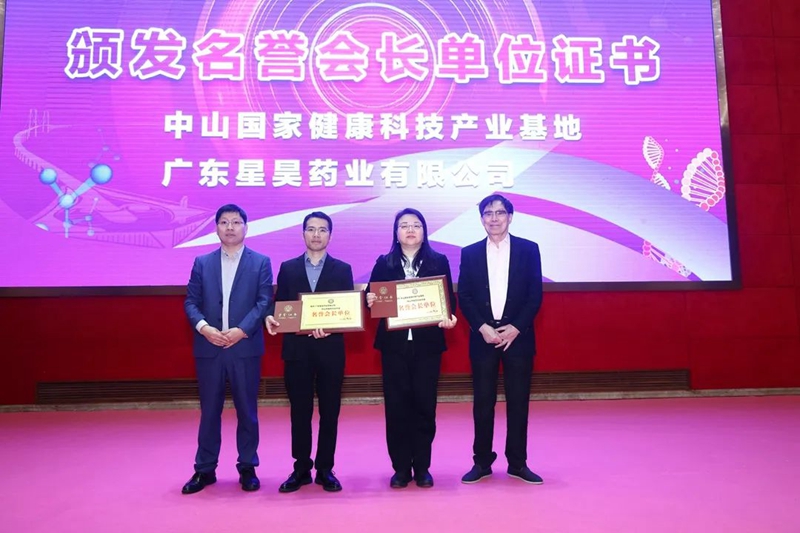 大會共產(chǎn)生了33個理事單位、3個監(jiān)事單位,選舉了會長單位、監(jiān)事長單位各1個,副會長單位1個、秘書長1名,并聘請了9名發(fā)展顧問,授予了中山國家健康科技產(chǎn)業(yè)基地和廣東星昊藥業(yè)有限公司為名譽會長單位。