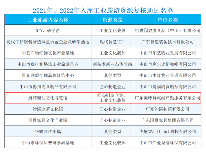 廣東工業(yè)旅游資源復(fù)核近日,廣東省工業(yè)和信息化廳、廣東省文化和旅游廳聯(lián)合公布了2024年廣東省工業(yè)旅游培育資源庫(kù)入庫(kù)名單及2021年、2022年入庫(kù)工業(yè)旅游資源復(fù)核通過名單。健康基地園區(qū)企業(yè)廣東美味鮮調(diào)味食品有限公司旗下“廚邦醬油文化博覽館”成功通過2021年、2022年入庫(kù)工業(yè)旅游資源復(fù)核。