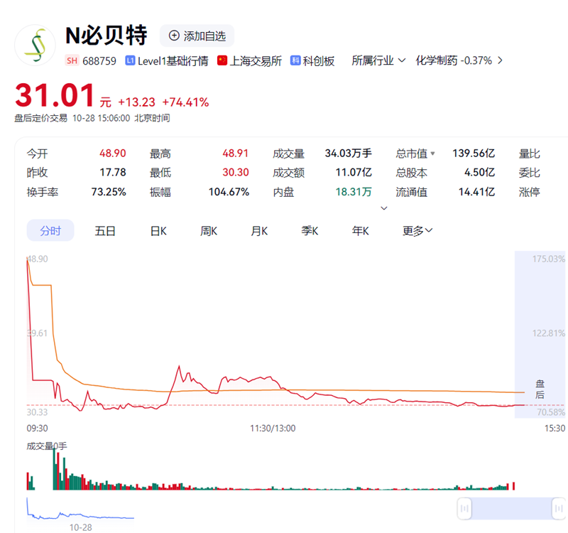 上市首日,必貝特醫(yī)藥開盤價為48.90元/股,較發(fā)行價17.78元/股大幅上漲174.91%,截至今日收盤,股價報31.01元,總市值139.56億元。