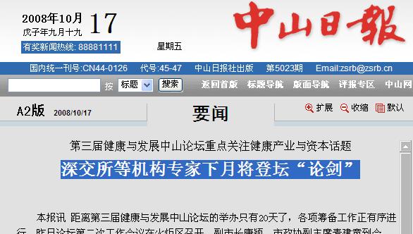 據(jù)了解,11月7日至8日將舉辦的第三屆中山論壇定位高端與專業(yè),由國家中醫(yī)藥管理局、中山市人民政府、廣東省食品藥品監(jiān)督管理局、中國科技金融促進(jìn)會風(fēng)險投資專業(yè)委員會等多家單位聯(lián)合主辦,重點(diǎn)關(guān)注健康產(chǎn)業(yè)與資本的話題。屆時,深交所副總經(jīng)理陳鴻橋、SFDA南方醫(yī)藥經(jīng)濟(jì)研究所所長林建寧等十多位嘉賓,將在論壇上發(fā)表主題演講。與會專家將圍繞高新技術(shù)企業(yè)認(rèn)定的最新政策,健康產(chǎn)業(yè)的發(fā)展態(tài)勢,IPO上市的作業(yè)規(guī)則和方法,中國風(fēng)投的最新趨勢等展開研討。與此同時,論壇將同期舉行省、市聯(lián)動培育健康產(chǎn)業(yè)示范基地項目掛牌、擔(dān)保公司成立儀式、產(chǎn)權(quán)交易所掛牌儀式、投資基金成立啟動儀式、“中國化妝品之都”揭牌儀式、“健康產(chǎn)業(yè)投融資平臺”成立儀式等系列活動。