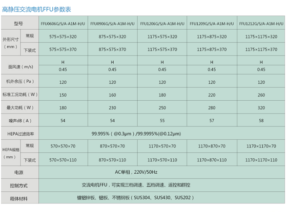 1. 采用AC高性能節(jié)能風機,效率高、能耗低; 2 .特殊的風道設計,風阻低,氣流暢; 3. 內部順風導流通道,風壓擴散穩(wěn)定,出風風速均勻; 4. 在額定風量下,機組機外余壓不小于120Pa;